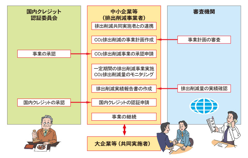 中小企業などが省エネ化を進めてCO2排出量を減らし、削減分を大企業などに買い取ってもらう仕組みの事です。大企業側は自主的に定めた削減目標の達成に活用でき、中小企業側は一定の収入が得られます。